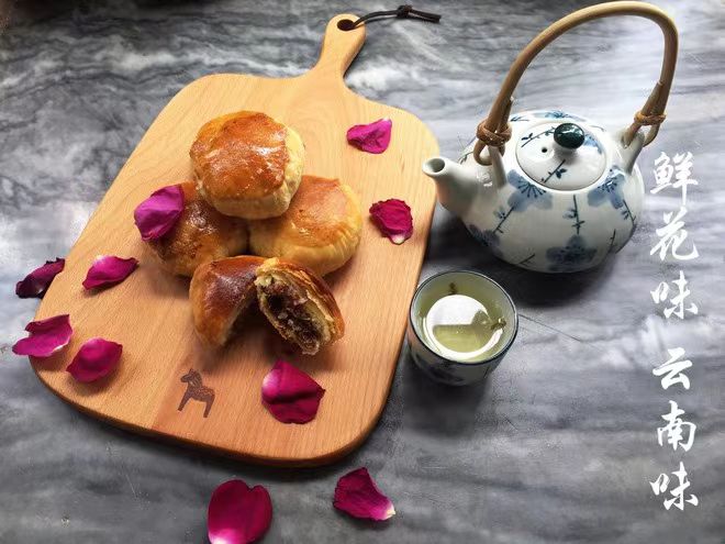 鲜花饼是以云南特有的食用玫瑰花入料的酥饼,是具有云南特色的云南经典点心代表鲜花饼是以云南特有的食用玫瑰花入料的酥饼,是具有云南特色的云南经典点心代表,也是众多来云南旅游的游客手信必备。鲜花饼花香浓郁,皮子酥软,是当地人非常喜爱的点心,但是真正的鲜花饼一定是有鲜花的季节用鲜花制作的,差不多三月底至九月份,而非一年四季都有。只有这样的才能称之为鲜花饼,否则使用糟玫瑰的就只是玫瑰饼了。
