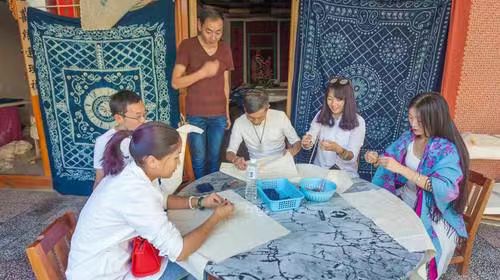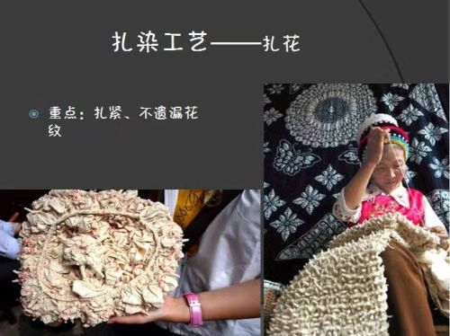 扎染是白族的传统工艺,分为扎结和染色两部分。它是通过纱、线、绳等工具,对织物进行扎、缝、缚、缀、夹等多种形式组合后进行染色。其工艺特点是用线在被印染的织物打绞成结后,再进行印染,然后把打绞成结的线拆除的一种印染技术